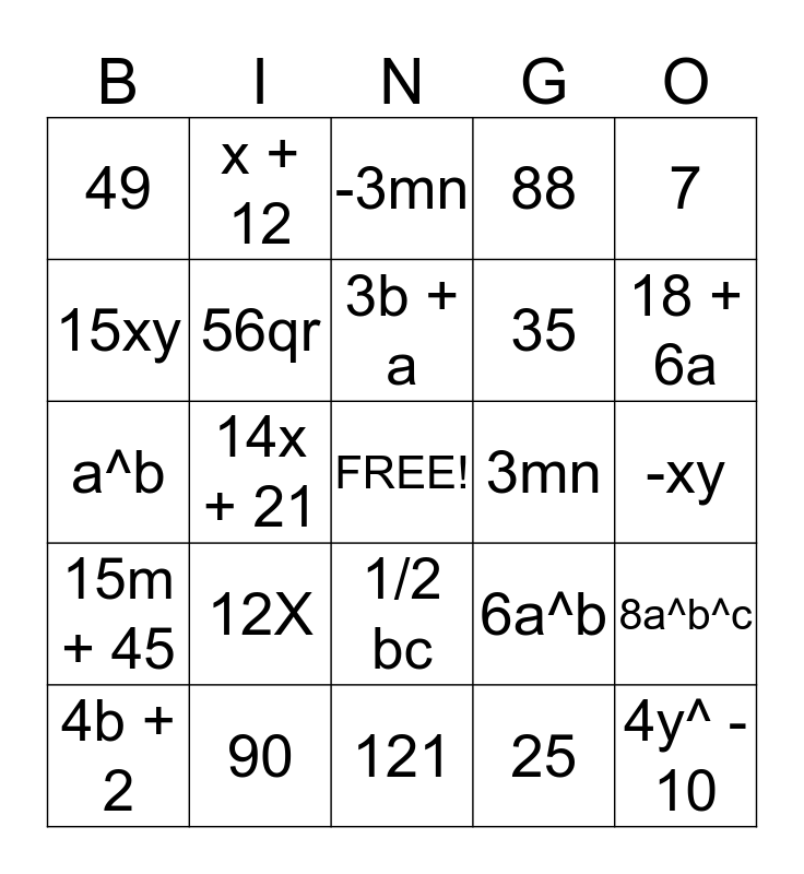 This bingo card has a free space and 24 words: 12X, 90, 3b + a, 4b + 2, 7, 49, 15xy, x + 12, 3mn, 1/2 bc, 35, a^b, 6a^b, 8a^b^c, 56qr, 25, -xy, -3mn, 18 + 6a, 14x + 21, 4y^ - 10, 15m + 45, 88 and 121.