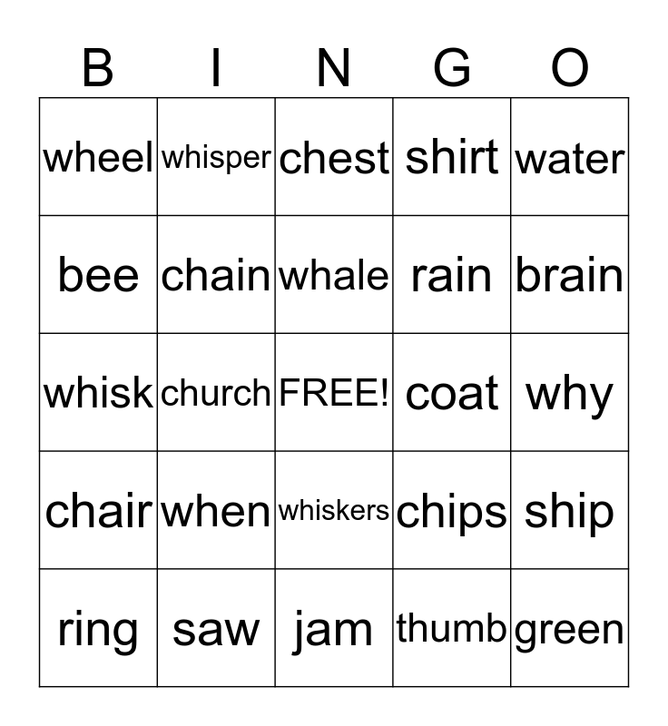 This bingo card has a free space and 24 words: when, saw, whale, ring, water, wheel, bee, whisper, coat, whiskers, rain, whisk, chips, ship, chain, thumb, why, chest, brain, church, green, chair, shirt and jam.