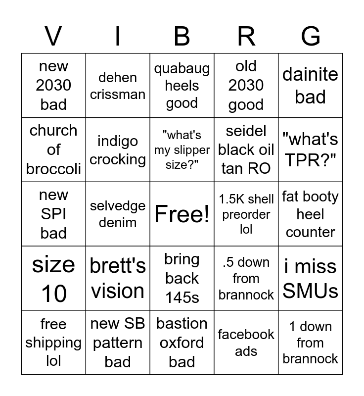 This bingo card has a free space and 24 words: brett's vision, new SB pattern bad, "what's my slipper size?", free shipping lol, dainite bad, new 2030 bad, church of broccoli, dehen crissman, 1.5K shell preorder lol, bring back 145s, seidel black oil tan RO, new SPI bad, .5 down from brannock, i miss SMUs, indigo crocking, facebook ads, fat booty heel counter, quabaug heels good, "what's TPR?", selvedge denim, 1 down from brannock, size 10, old 2030 good and bastion oxford bad.