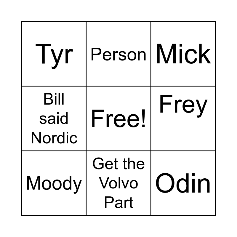 This bingo card has a free space and 8 words: Frey, Mick, Person, Moody, Tyr, Odin, Bill said Nordic and Get the Volvo Part.