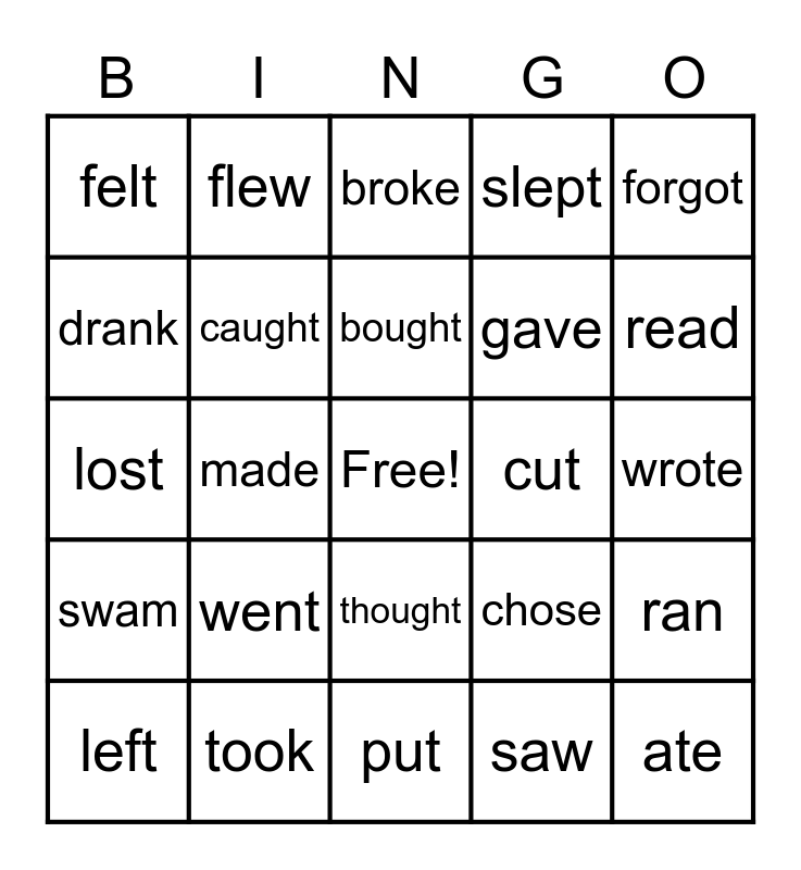 This bingo card has a free space and 30 words: took, taught, made, kept, felt, broke, caught, thought, cut, put, wrote, ate, saw, found, read, woke, chose, swam, went, forgot, lost, hit, flew, gave, drank, slept, ran, left, bought and spoke.