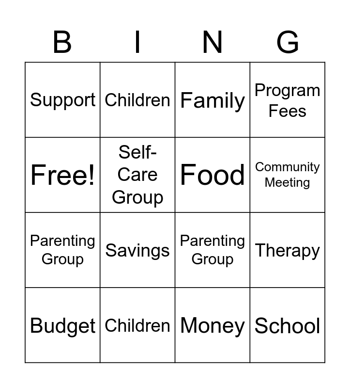 This bingo card has 40 words: Case Management, Parenting Group, Self-Care Group, Food, Clothing, Education, Community Meeting, Neighbors, Free!, School, Therapy, Program Fees, Budget, Money, Children, Childcare, Savings, Support, Love, Family, Case Management, Community Meeting, Parenting Group, Self-Care Group, Food, Clothing, School, Education, Childcare, Money, Budget, Therapy, Neighbors, Program Fees, Savings, Support, Love, Family, Children and Utilities.