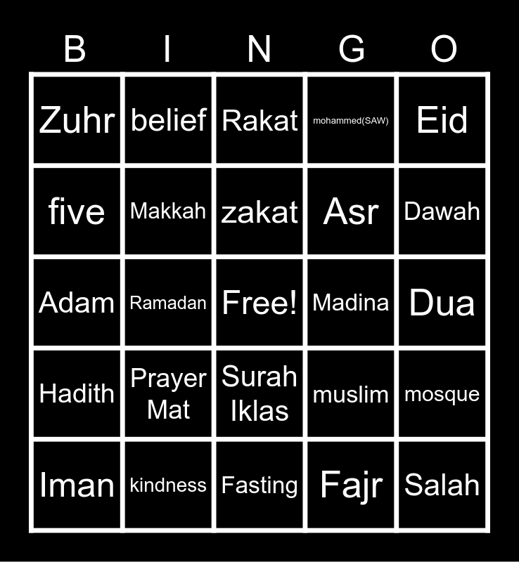 This bingo card has a free space and 51 words: Quran, Salah, Hajj, Fasting, Prayer Mat, Prophets, belief, charity, five, islam, Makkah, mohammed(SAW), mosque, muslim, pillars, shahadah, zakat, Madina, Zamzam Water, Eid, Ramadan, Fajr, Zuhr, Asr, Magrib, Isha, Dawah, Assalamu Alaikum, Iman, Rakat, Deen, Iftar, Muslim, Sujood, Companion, kindness, Iman, Halal, Kabah, Masjid, Dua, Hadith, Sunnah, Hijab, Allah, Isa, Adam, Jannah, Surah Naz, Surah Iklas and Surah Falaq.