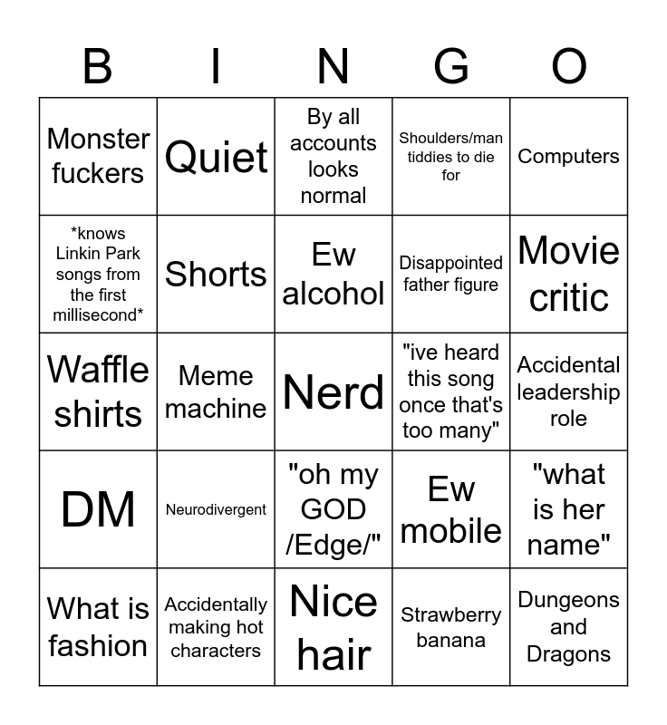 This bingo card has a free space and 24 words: Neurodivergent, Accidentally making hot characters, Ew alcohol, What is fashion, Computers, Monster fuckers, *knows Linkin Park songs from the first millisecond*, Quiet, "ive heard this song once that's too many", "oh my GOD /Edge/", Disappointed father figure, Waffle shirts, Ew mobile, "what is her name", Shorts, Strawberry banana, Accidental leadership role, By all accounts looks normal, Movie critic, Meme machine, Dungeons and Dragons, DM, Shoulders/man tiddies to die for and Nice hair.