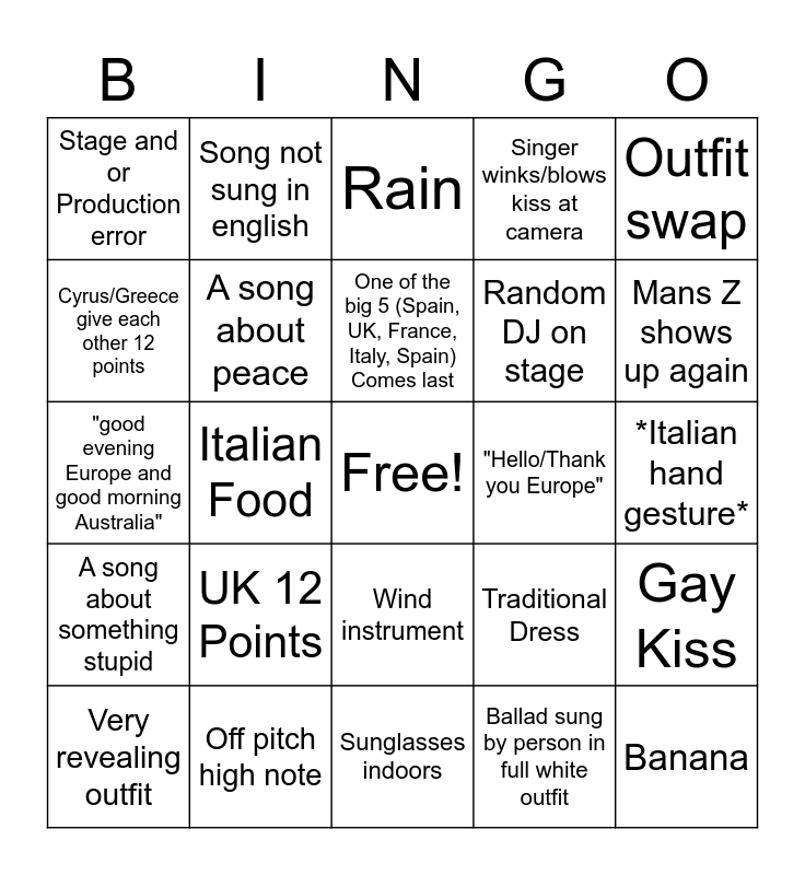 This bingo card has a free space and 42 words: FIRE, One of the big 5 (Spain, UK, France, Italy, Spain) Comes last, UK NIL POINTS, UK 12 Points, Ballad sung by person in full white outfit, Gay Kiss, Banana, HAT, Rain, Wind instrument, *Italian hand gesture*, Mans Z shows up again, Italian Food, Outfit swap, Very hetero duet, Traditional Dress, bare feet, "good evening Europe and good morning Australia", France has an Eiffel tower somewhere, Song not sung in english, Cyrus/Greece give each other 12 points, Ukraine Wins, LGBT flag in crowd, Stage and or Production error, Disco Ball, Really fake instrument playing, Random DJ on stage, Booing, Wings, Glitter cannon, A song about love, A song about something stupid, A song about peace, Sunglasses indoors, Singer doesn't move at all during performance due to large outfit, Very revealing outfit, Off pitch high note, "Hello/Thank you Europe", voice cracks, A country ends on 0 points, Singer winks/blows kiss at camera and Famous Person shows up.