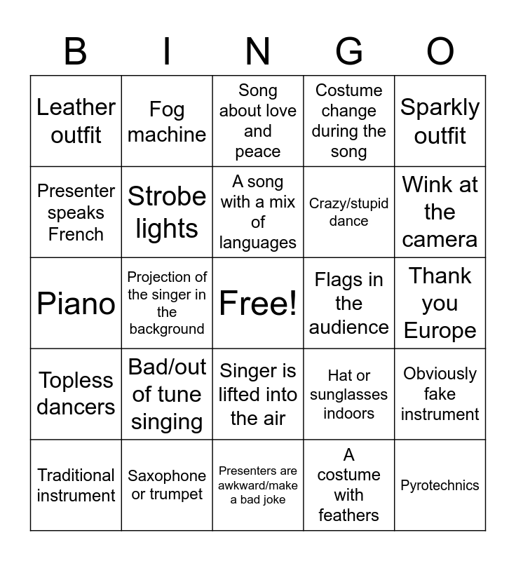 This bingo card has a free space and 24 words: Bad/out of tune singing, Saxophone or trumpet, A song with a mix of languages, Traditional instrument, Sparkly outfit, Leather outfit, Presenter speaks French, Fog machine, Flags in the audience, Singer is lifted into the air, Crazy/stupid dance, Piano, Hat or sunglasses indoors, Obviously fake instrument, Strobe lights, A costume with feathers, Thank you Europe, Song about love and peace, Wink at the camera, Projection of the singer in the background, Pyrotechnics, Topless dancers, Costume change during the song and Presenters are awkward/make a bad joke.