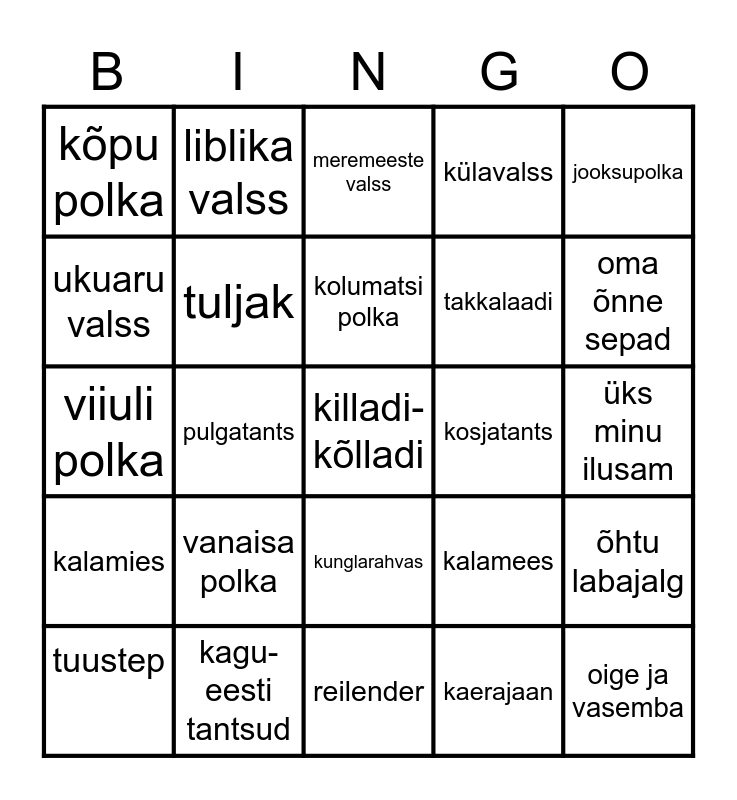 This bingo card has a free space and 24 words: tuustep, vanaisa polka, kolumatsi polka, kaerajaan, jooksupolka, kõpu polka, liblika valss, meremeeste valss, kosjatants, üks minu ilusam, viiuli polka, tuljak, kalamees, õhtu labajalg, ukuaru valss, kagu-eesti tantsud, reilender, külavalss, oma õnne sepad, kalamies, pulgatants, kunglarahvas, takkalaadi and oige ja vasemba.