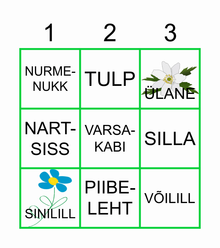 This bingo card has 2 images and 9 words: SINILILL, ÜLANE, TULP, NART-SISS, NURME- NUKK, SILLA, VARSA-KABI, VÕILILL and PIIBE-LEHT.