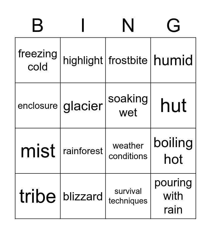This bingo card has 16 words: blizzard, boiling hot, frostbite, freezing cold, mist, highlight, weather conditions, survival techniques, enclosure, glacier, tribe, humid, rainforest, hut, soaking wet and pouring with rain.