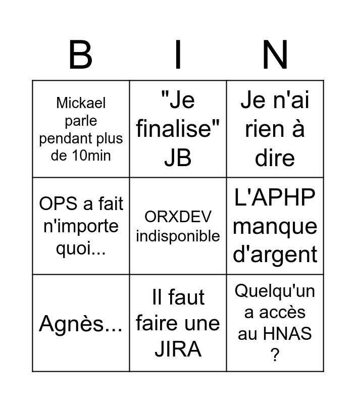 This bingo card has a free space and 8 words: L'APHP manque d'argent, Je n'ai rien à dire, "Je finalise" JB, Agnès..., Mickael parle pendant plus de 10min, Quelqu'un a accès au HNAS ?, OPS a fait n'importe quoi... and Il faut faire une JIRA.