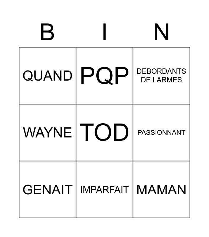 This bingo card has a free space and 14 words: OU, RETENTISSANTE, GENAIT, PQP, WAYNE, MAMAN, SI + IMP., TRESSAIT, IMPARFAIT, QUAND, DEAN, PASSIONNANT, DEBORDANTS DE LARMES and FUTURE SIMP..