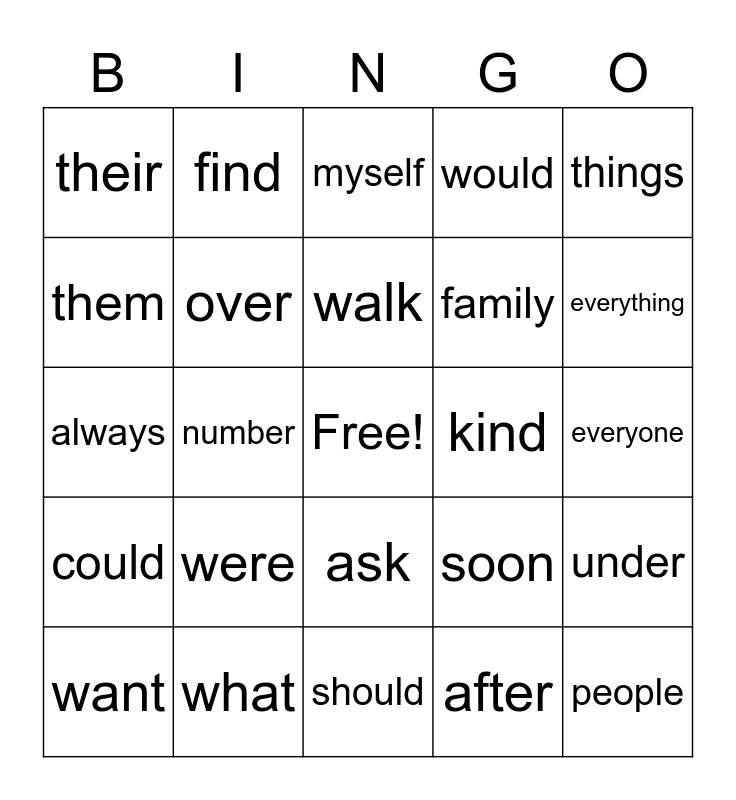 This bingo card has a free space and 24 words: were, what, walk, want, things, their, them, find, kind, ask, family, always, soon, under, over, after, everyone, myself, everything, number, people, could, would and should.