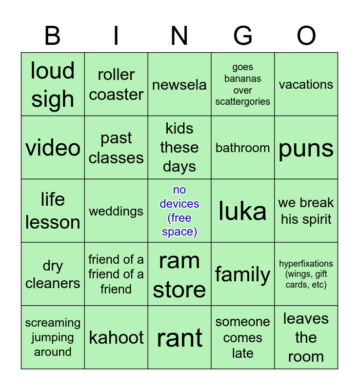 This bingo card has a free space and 24 words: friend of a friend of a friend, kahoot, kids these days, screaming jumping around, vacations, loud sigh, video, roller coaster, luka, ram store, bathroom, life lesson, family, hyperfixations (wings, gift cards, etc), past classes, someone comes late, we break his spirit, newsela, puns, weddings, leaves the room, dry cleaners, goes bananas over scattergories and rant.