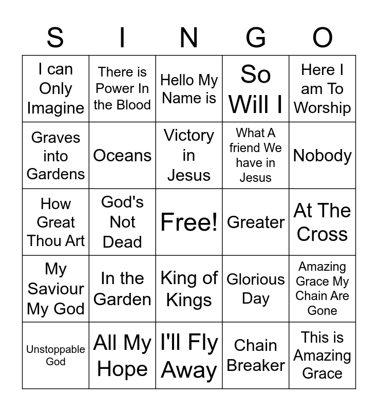 This bingo card has a free space and 35 words: . What a Beautiful Name, Amazing Grace it is well with my soul, Our God, Oceans, King of Kings, So Will I, Graves into Gardens, When we all get to Heaven, Victory in Jesus, Cornerstone, How Great Thou Art, Here I am To Worship, You Are My Vision, Days of Elijah, I can Only Imagine, Greater, Chain Breaker, God's Not Dead, My Saviour My God, This is Amazing Grace, Glorious Day, Unstoppable God, Amazing Grace My Chain Are Gone, All My Hope, Hello My Name is, Nobody, Eqypt, Witness, What A friend We have in Jesus, At The Cross, When the Roll is Called Up Yonder, I'll Fly Away, In the Garden, There is Power In the Blood and Blessed Assurance.
