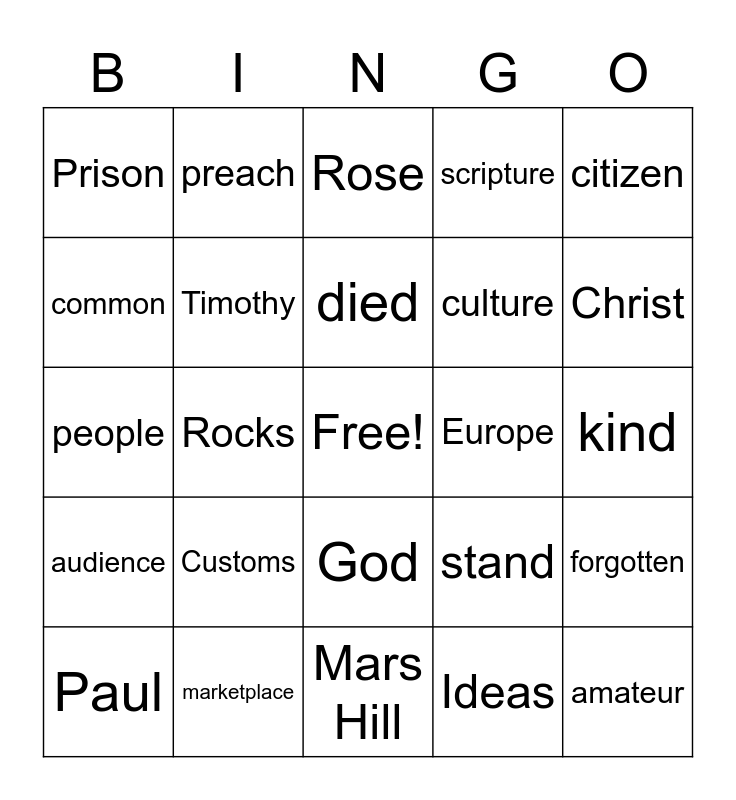 This bingo card has a free space and 29 words: Paul, Athens, Rocks, Silas, Prison, Rose, Timothy, Customs, Europe, marketplace, kind, amateur, Mars Hill, Ideas, Christ, intellectuals, God, audience, citizen, people, stand, love, culture, common, scripture, preach, forgotten, died and outward.