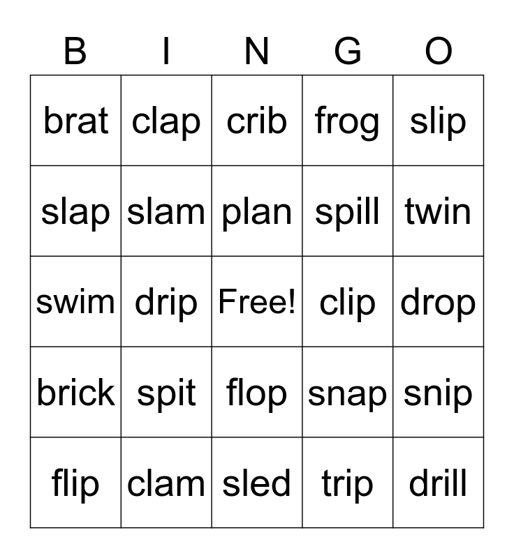 This bingo card has a free space and 24 words: spit, clam, plan, flip, slip, brat, slap, clap, clip, flop, spill, swim, snap, snip, slam, trip, drop, crib, twin, drip, drill, brick, frog and sled.
