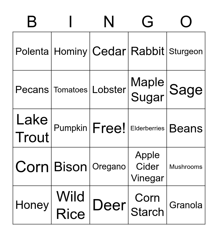 This bingo card has a free space and 29 words: Honey, Wild Ginger, Pumpkin, Squash, Polenta, Cedar, Tomatoes, Bison, Elderberries, Wild Rice, Beans, Granola, Deer, Corn Starch, Sage, Sweet Potatoes, Oregano, Corn, Sturgeon, Lake Trout, Apple Cider Vinegar, Corn Meal, Maple Sugar, Pecans, Rabbit, Hominy, Mushrooms, Lobster and Cactus.