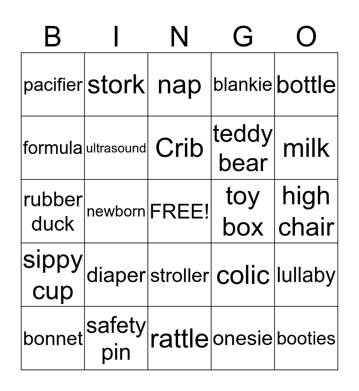 This bingo card has a free space and 24 words: diaper, safety pin, Crib, bonnet, bottle, pacifier, formula, stork, toy box, stroller, teddy bear, rubber duck, colic, lullaby, ultrasound, onesie, high chair, nap, milk, newborn, booties, sippy cup, blankie and rattle.