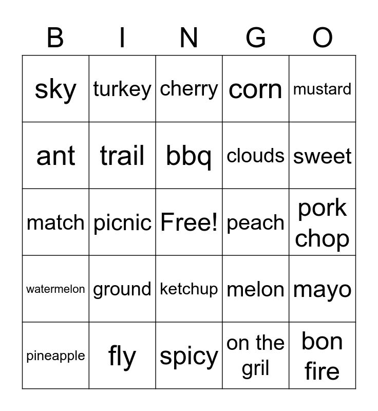 This bingo card has a free space and 24 words: ground, fly, bbq, pineapple, mustard, sky, ant, turkey, peach, ketchup, clouds, match, melon, mayo, trail, on the gril, pork chop, cherry, sweet, picnic, bon fire, watermelon, corn and spicy.