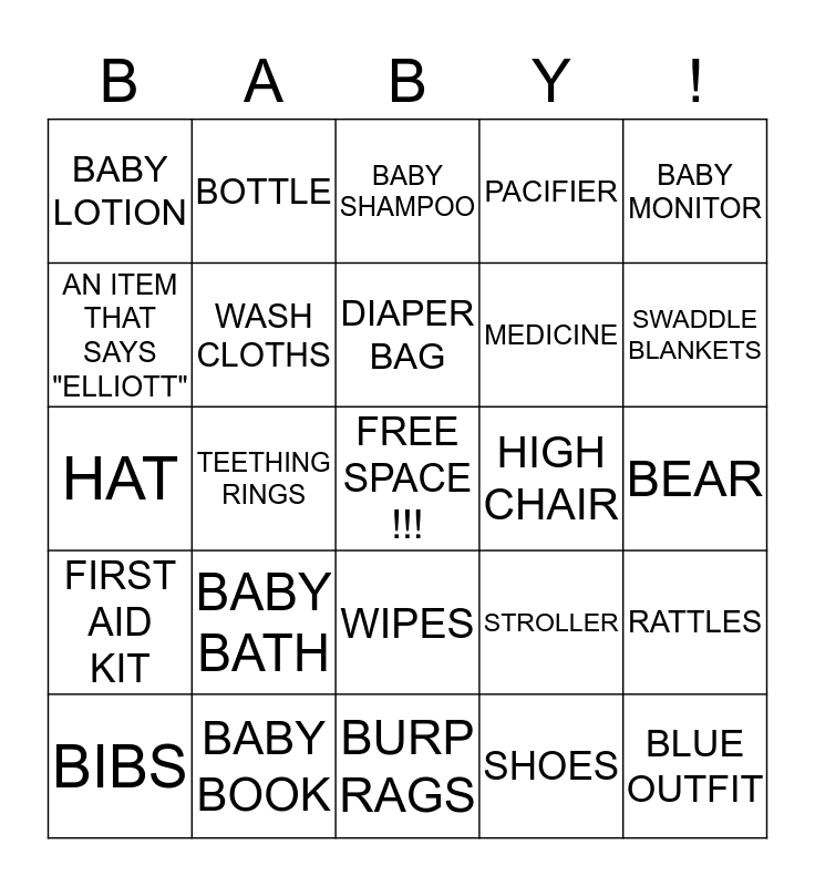 This bingo card has a free space and 29 words: BIBS, ONSIES, TEETHING RINGS, THERMOMMETER, BABY LOTION, BABY SHAMPOO, WASH CLOTHS, BABY BATH, HIGH CHAIR, BABY BOOK, BEAR, BLUE OUTFIT, BURP RAGS, SHOES, SWADDLE BLANKETS, BLANKIES, WIPES, FIRST AID KIT, BABY MONITOR, HAT, STROLLER, MITTENS, MEDICINE, AN ITEM THAT SAYS "ELLIOTT", PACIFIER, BOTTLE, RATTLES, DIAPER BAG and NIGHT TIME LOTION.