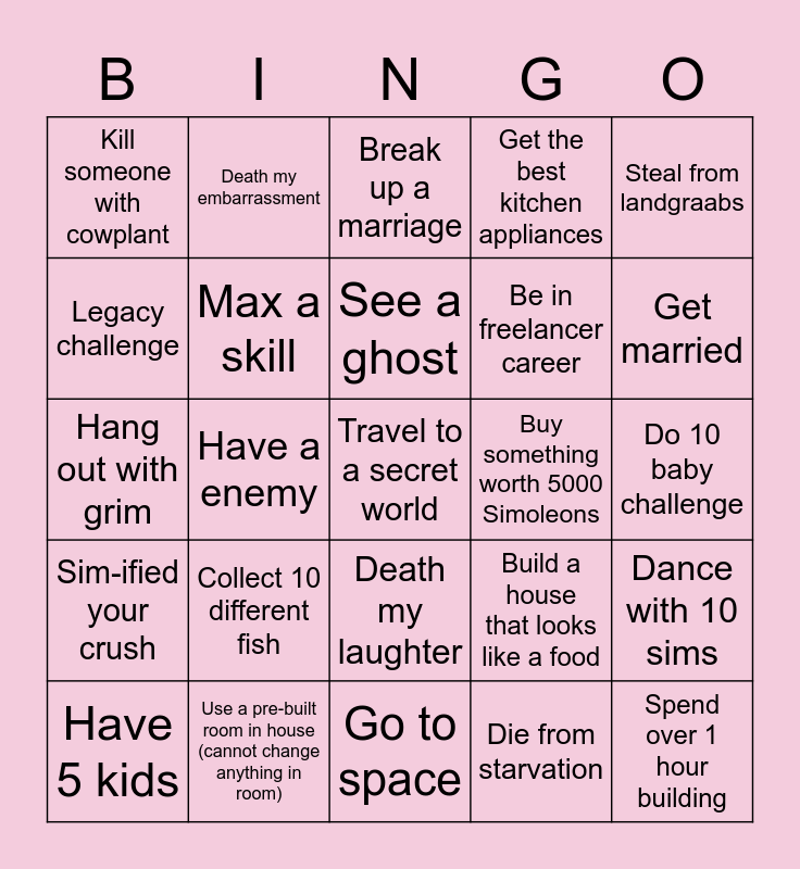 This bingo card has 56 words: Create a basement, Have 5 kids, Get fired, Kill someone with cowplant, Go to space, Kill one sim, Max a skill, Build a rocket, Be in freelancer career, Build a toddler only room Min - 5 x 5, Get the best kitchen appliances, Get 1M Simoleons, Cheat on partner, Be promoted, Have twins, Have kid(s) taken, Steal from landgraabs, Have a enemy, Make a house 3 floors (decorated), Travel to a secret world, Buy something worth 5000 Simoleons, Do a shell challenge, Build a house that looks like a food, Break up a marriage, Get highest promotion in a career, See a ghost, Master violin, Master a aspiration, Get married, Complete 5 whims, Change emotions 3 times in 5 seconds, Have your electric turned off, Throw party, Complete a scenario, Do 10 baby challenge, Legacy challenge, Hang out with grim, Sim-ified a celebrity, Sim-ified your crush, Death my embarrassment, Death my laughter, Spend over 1 hour building, Have over 1M followers on Simstagram, Leave game running for 1h, Teach another sim a skill to lv 3, Collect 10 different fish, Use a pre-built room in house (cannot change anything in room), Use a voodoo doll, Complete a date and get gold medal, Paint something worth more than 200 Simoleons, Die from starvation, Breed a frog, Get 10 food delivery’s, Marry 2 times, Dance with 10 sims and Grow a cow plant.