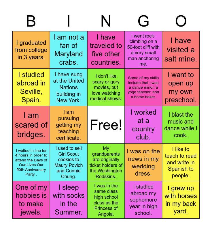This bingo card has a free space and 24 words: I used to sell Girl Scout cookies to Maury Povich and Connie Chung., I sleep with socks in the Summer., I don't like scary or gory movies, but love watching medical shows., One of my hobbies is to make jewels., I have visited a salt mine., I graduated from college in 3 years., I studied abroad in Seville, Spain., I am not a fan of Maryland crabs., I worked at a country club., My grandparents are originally ticket holders of the Washington Redskins., Some of my skills include that I was a dance minor, a yoga teacher, and a home baker., I am scared of bridges., I was on the news in my wedding dress., I like to teach to read and write in Spanish to people., I have sung at the United Nations building in New York., I studied abroad my sophomore year in high school., I blast the music and dance while I cook., I have traveled to five other countries., I want to open up my own preschool., I am pursuing getting my teaching certificate., I grew up with horses in my back yard., I waited in line for 4 hours in order to attend the Days of Our Lives Our 50th Anniversary Party ., I went rock-climbing on a 50-foot cliff with a very small man anchoring me. and I was in the same class high school class as the Princess of Angola..