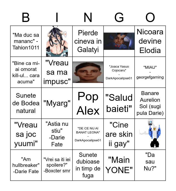 This bingo card has 5 images, a free space and 24 words: "Am hullbreaker" -Darie Fate, "ARE ZHONYA", "Myarg", "O iesit episod nou din anime" -DarkApocalipse01, "Ma duc sa mananc" -Tahion1011, Pierde cineva in Galatyi, "Vreau sa ma impusc", "Astia nu stiu" -Darie Fate, "Salud baieti", "Vrei sa iti iei spoilere?" -Boxcter smr, Banare Aurelion Sol (sugi pula Darie), "Da sau Nu?", Sunete dubioase in timp de fuga, "Main YONE", "MIAU" -georgefgaming, "Citeam Naruto", "DE CE NU AI BANAT LEONA" -DarkApocalipse01, "Vreau sa joc yuumi", Nicoara devine Elodia, Sunete de Bodea natural, "Cine are skin ii gay", "Ma duc sa intez" -Tahion1011, "Joaca Yasuo Cojocaru" -DarkApocalipse01 and "Bine ca mi-ai omorat kill-ul... cara acuma".