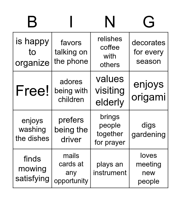 This bingo card has 16 words: mails cards at any opportunity, digs gardening, relishes coffee with others, is happy to organize, enjoys washing the dishes, favors talking on the phone, brings people together for prayer, plays an instrument, Free!, adores being with children, finds mowing satisfying, decorates for every season, prefers being the driver, enjoys origami, values visiting elderly and loves meeting new people.