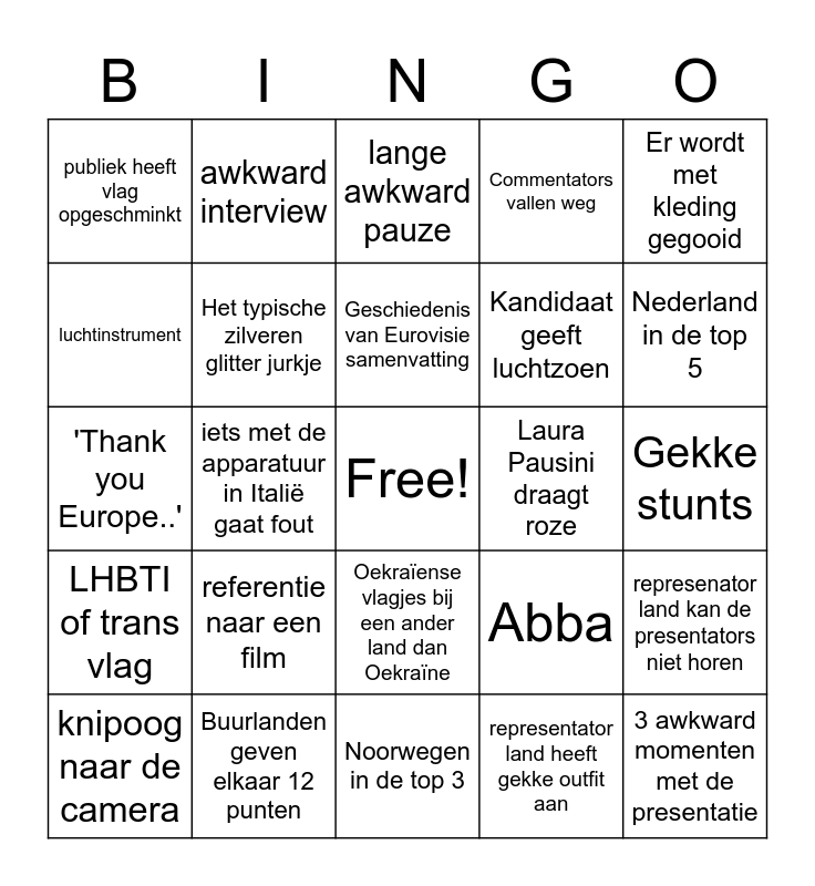 This bingo card has a free space and 40 words: Duitsland 0 punten (jury of televote), 'Thank you Europe..', 2 slechte uithalen (hetzelfde of verschillende landen), Het typische zilveren glitter jurkje, Buurlanden geven elkaar 12 punten, Oekraïense vlagjes bij een ander land dan Oekraïne, Geschiedenis van Eurovisie samenvatting, Oude Eurovisie mensen komen (Maneskin telt niet), Er wordt met kleding gegooid, LHBTI of trans vlag, iets met de apparatuur in Italië gaat fout, Commentators vallen weg, 3 awkward momenten met de presentatie, Gekke stunts, Laura Pausini draagt roze, referentie naar een film, politieke statement, publiek heeft vlag opgeschminkt, costume change midden in lied, lange awkward pauze, represenator land kan de presentators niet horen, representator land heeft gekke outfit aan, Kandidaat geeft luchtzoen, luchtinstrument, windmachine, Noorwegen 12 punten, Mika heeft 3 verschillende outfits met 3 verschillende kleuren, Oekraïne krijgt pity points, Vals gezongen, Litouwen aapt presentator na als ze praten, 'Love you Turin!', knipoog naar de camera, Hartje naar de camera met handen, Abba, Nederland in de top 5, Noorwegen in de top 3, 'Grote kanshebber voor de winst', '12 points go to....' té lange pauze, awkward interview and lelijke filters op de camera.