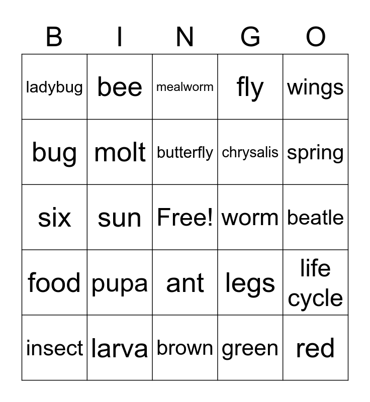 This bingo card has a free space and 24 words: pupa, larva, butterfly, insect, wings, ladybug, bug, bee, worm, ant, chrysalis, six, legs, life cycle, molt, green, beatle, mealworm, spring, sun, red, food, fly and brown.