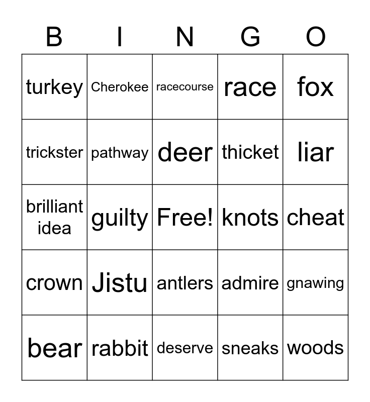 This bingo card has a free space and 24 words: Jistu, rabbit, deer, bear, fox, turkey, trickster, Cherokee, knots, antlers, thicket, brilliant idea, admire, gnawing, pathway, sneaks, cheat, racecourse, liar, guilty, woods, crown, race and deserve.