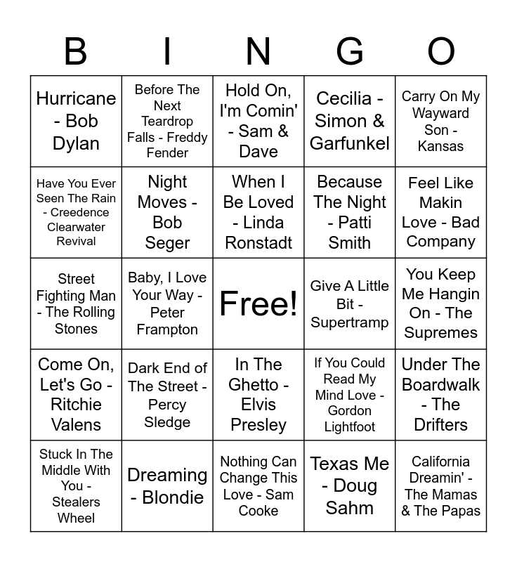 This bingo card has a free space and 49 words: Never My Love - The Association, California Dreamin' - The Mamas & The Papas, The He Kissed Me - The Crystals, Nothing Can Change This Love - Sam Cooke, Dark End of The Street - Percy Sledge, Working My Way To Back To You - Franki Valli & The Four Seasons, Before The Next Teardrop Falls - Freddy Fender, Summer Wine - Nancy Sinatra, Lee Hazlewood, Have You Ever Seen The Rain - Creedence Clearwater Revival, Never Going Back Again - Fleetwood Mac, Night Moves - Bob Seger, Cecilia - Simon & Garfunkel, Under The Boardwalk - The Drifters, If You Could Read My Mind Love - Gordon Lightfoot, Take Me Home, Country Roads - John Denver, You're So Vain - Carly Simon, When I Be Loved - Linda Ronstadt, Give A Little Bit - Supertramp, Blinded By The Light - Manfred Mann's Earth Band, Carry On My Wayward Son - Kansas, Baby, I Love Your Way - Peter Frampton, Texas Me - Doug Sahm, Hurricane - Bob Dylan, Because The Night - Patti Smith, All Along The Watchtower - Jimi Hendrix, Feel Like Makin Love - Bad Company, Stuck In The Middle With You - Stealers Wheel, Long Tall Sally - Little Richard, In The Ghetto - Elvis Presley, Come On, Let's Go - Ritchie Valens, The Weight - The Band, I Fought The Law - The Bobby Fuller Four, Baby Don't Go - Sonny & Cher, The Letter - The Box Tops, Dreaming - Blondie, Marquee Moon - Television, Get Down Make Love - Queen, If You Leave Me Now - Chicago, You Keep Me Hangin On - The Supremes, Lean on Me - Bill Withers, Try A LIttle Tenderness - Otis Redding, Not Fade Away - Buddy Holly & The Crickets, I Drove All Night - Roy Orbison, The Crystal Ship - The Doors, Street Fighting Man - The Rolling Stones, Hold On, I'm Comin' - Sam & Dave, Piece of My Heart - Erma Franklin, At Seventeen - Janis Ian and The Rose - Bette Midler.
