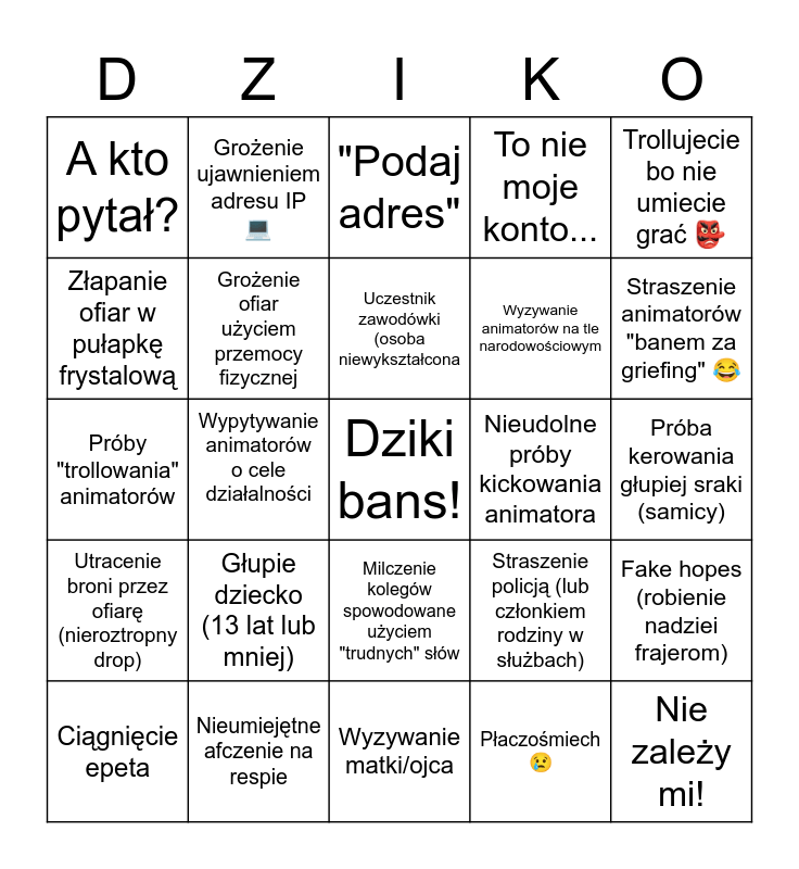 This bingo card has a free space and 24 words: Głupie dziecko (13 lat lub mniej), Nieumiejętne afczenie na respie, Uczestnik zawodówki (osoba niewykształcona, Ciągnięcie epeta, Trollujecie bo nie umiecie grać 👺, A kto pytał?, Złapanie ofiar w pułapkę frystalową, Grożenie ujawnieniem adresu IP 💻, Nieudolne próby kickowania animatora, Milczenie kolegów spowodowane użyciem "trudnych" słów, Wyzywanie animatorów na tle narodowościowym, Próby "trollowania" animatorów, Straszenie policją (lub członkiem rodziny w służbach), Fake hopes (robienie nadziei frajerom), Grożenie ofiar użyciem przemocy fizycznej, Płaczośmiech 😢, Próba kerowania głupiej sraki (samicy), "Podaj adres", Straszenie animatorów "banem za griefing" 😂, Wypytywanie animatorów o cele działalności, Nie zależy mi!, Utracenie broni przez ofiarę (nieroztropny drop), To nie moje konto... and Wyzywanie matki/ojca.