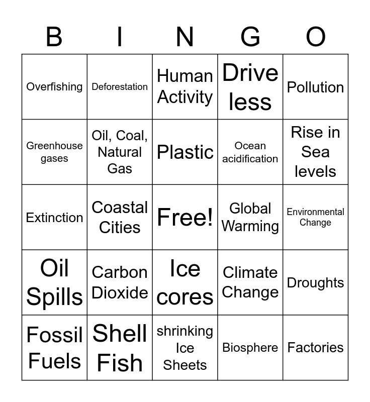 This bingo card has a free space and 24 words: Carbon Dioxide, Shell Fish, Plastic, Fossil Fuels, Pollution, Overfishing, Greenhouse gases, Deforestation, Global Warming, Ice cores, Ocean acidification, Extinction, Climate Change, Droughts, Oil, Coal, Natural Gas, Biosphere, Environmental Change, Human Activity, Rise in Sea levels, Coastal Cities, Factories, Oil Spills, Drive less and shrinking Ice Sheets.