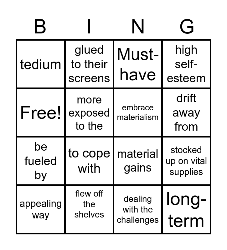 This bingo card has 16 words: flew off the shelves, stocked up on vital supplies, Must-have, tedium, be fueled by, glued to their screens, material gains, dealing with the challenges, Free!, more exposed to the, appealing way, high self‐esteem, to cope with, drift away from, embrace materialism and long-term.