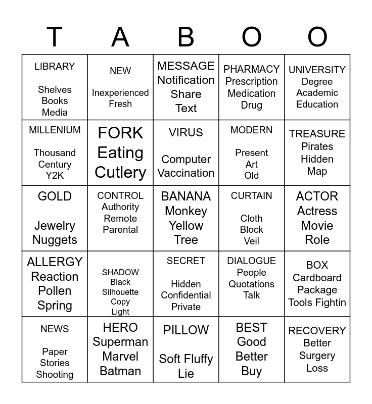 This bingo card has 25 words: SHADOW Black Silhouette Copy Light, PILLOW Soft Fluffy Lie, VIRUS Computer Vaccination, NEWS Paper Stories Shooting, UNIVERSITY Degree Academic Education, LIBRARY Shelves Books Media, MILLENIUM Thousand Century Y2K, NEW Inexperienced Fresh, CURTAIN Cloth Block Veil, SECRET Hidden Confidential Private, MODERN Present Art Old, GOLD Jewelry Nuggets, DIALOGUE People Quotations Talk, BOX Cardboard Package Tools Fightin, FORK Eating Cutlery, RECOVERY Better Surgery Loss, ACTOR Actress Movie Role, MESSAGE Notification Share Text, TREASURE Pirates Hidden Map, CONTROL Authority Remote Parental, BANANA Monkey Yellow Tree, HERO Superman Marvel Batman, ALLERGY Reaction Pollen Spring, PHARMACY Prescription Medication Drug and BEST Good Better Buy.