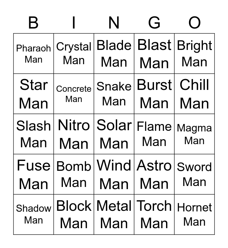 This bingo card has 25 words: Bomb Man, Metal Man, Snake Man, Shadow Man, Bright Man, Pharaoh Man, Star Man, Crystal Man, Flame Man, Wind Man, Burst Man, Slash Man, Astro Man, Sword Man, Concrete Man, Hornet Man, Magma Man, Blade Man, Chill Man, Nitro Man, Solar Man, Block Man, Fuse Man, Blast Man and Torch Man.