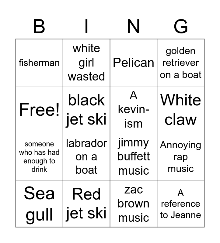 This bingo card has 16 words: Red jet ski, Annoying rap music, Pelican, fisherman, someone who has had enough to drink, white girl wasted, jimmy buffett music, zac brown music, Free!, black jet ski, Sea gull, golden retriever on a boat, labrador on a boat, White claw, A kevin-ism and A reference to Jeanne.