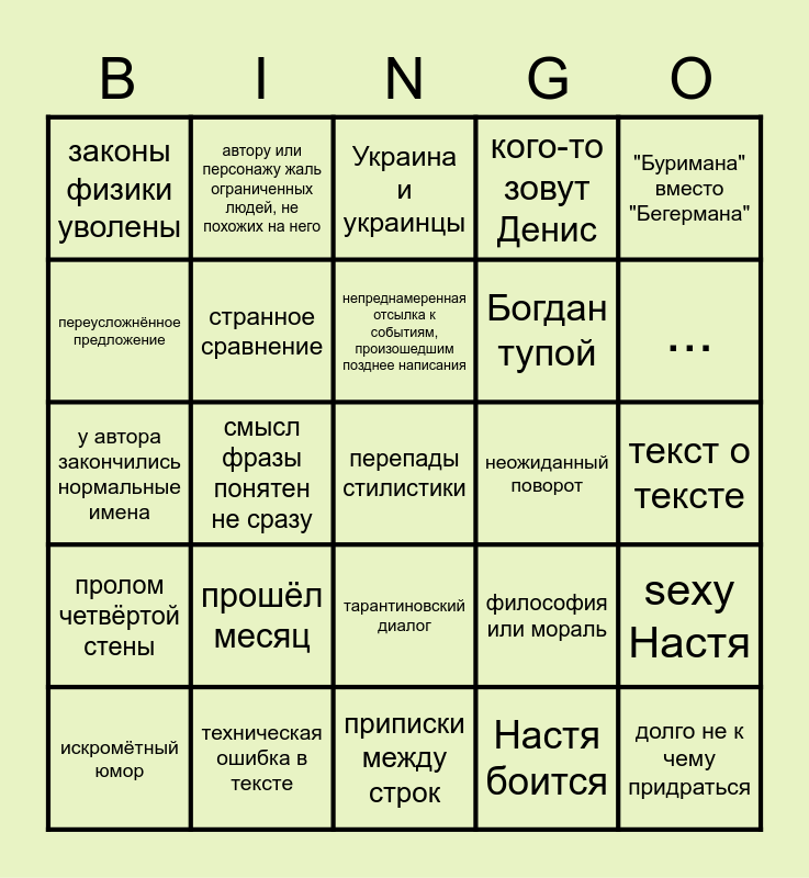 This bingo card has 28 words: sexy Настя, Дима страдает, Богдан тупой, Настя боится, переусложнённое предложение, Украина и украинцы, автору или персонажу жаль ограниченных людей, не похожих на него, пролом четвёртой стены, неожиданный поворот, искромётный юмор, у автора закончились нормальные имена, кого-то зовут Денис, техническая ошибка в тексте, приписки между строк, ..., неизъяснимый ужас, прошёл месяц, странное сравнение, непреднамеренная отсылка к событиям, произошедшим позднее написания, тарантиновский диалог, законы физики уволены, долго не к чему придраться, перепады стилистики, смысл фразы понятен не сразу, текст о тексте, философия или мораль, "Буримана" вместо "Бегермана" and ошибка синтаксическая, орфографическая, пунктуационная, грамматическая и всё такое.