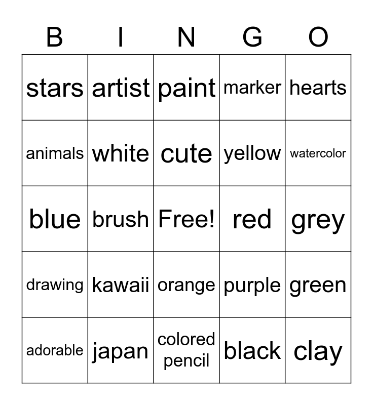 This bingo card has a free space and 24 words: kawaii, japan, cute, adorable, hearts, stars, animals, artist, red, orange, yellow, blue, purple, green, white, black, grey, paint, watercolor, brush, clay, drawing, marker and colored pencil.