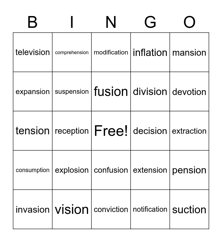 This bingo card has a free space and 24 words: explosion, vision, fusion, invasion, mansion, television, expansion, comprehension, decision, confusion, division, tension, extension, pension, suspension, notification, extraction, modification, devotion, reception, suction, consumption, inflation and conviction.