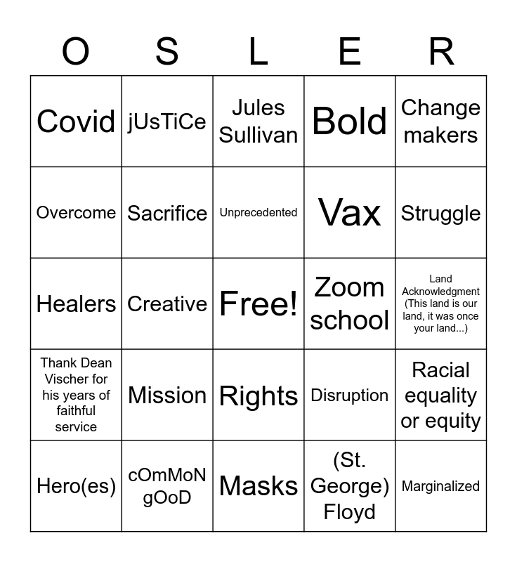 This bingo card has a free space and 24 words: Mission, cOmMoN gOoD, Unprecedented, Hero(es), Change makers, Covid, Overcome, jUsTiCe, Zoom school, Rights, Vax, Healers, Disruption, Racial equality or equity, Sacrifice, (St. George) Floyd, Land Acknowledgment (This land is our land, it was once your land...), Jules Sullivan, Struggle, Creative, Marginalized, Thank Dean Vischer for his years of faithful service, Bold and Masks.