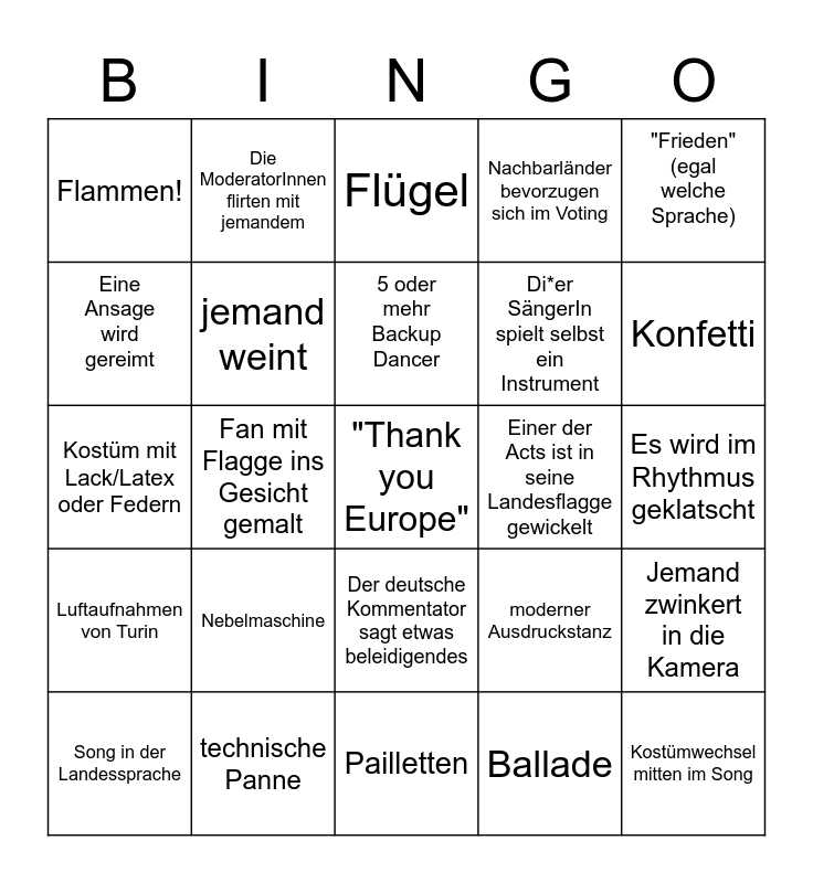 This bingo card has 25 words: Nebelmaschine, Pailletten, 5 oder mehr Backup Dancer, Song in der Landessprache, "Frieden" (egal welche Sprache), Flammen!, Eine Ansage wird gereimt, Die ModeratorInnen flirten mit jemandem, Einer der Acts ist in seine Landesflagge gewickelt, Der deutsche Kommentator sagt etwas beleidigendes, Di*er SängerIn spielt selbst ein Instrument, Kostüm mit Lack/Latex oder Federn, moderner Ausdruckstanz, Jemand zwinkert in die Kamera, jemand weint, Kostümwechsel mitten im Song, Es wird im Rhythmus geklatscht, Flügel, Konfetti, Fan mit Flagge ins Gesicht gemalt, "Thank you Europe", technische Panne, Luftaufnahmen von Turin, Nachbarländer bevorzugen sich im Voting and Ballade.