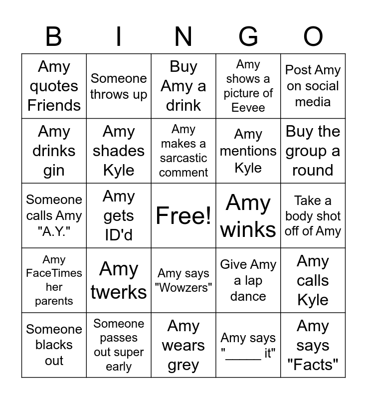 This bingo card has a free space and 24 words: Amy twerks, Someone passes out super early, Amy makes a sarcastic comment, Someone blacks out, Post Amy on social media, Amy quotes Friends, Amy drinks gin, Someone throws up, Amy winks, Amy says "Wowzers", Amy mentions Kyle, Someone calls Amy "A.Y.", Give Amy a lap dance, Amy calls Kyle, Amy shades Kyle, Amy says "_____ it", Take a body shot off of Amy, Buy Amy a drink, Buy the group a round, Amy gets ID'd, Amy says "Facts", Amy FaceTimes her parents, Amy shows a picture of Eevee and Amy wears grey.