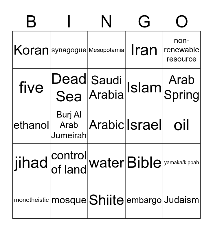 This bingo card has a free space and 24 words: control of land, mosque, Saudi Arabia, monotheistic, non-renewable resource, Koran, five, synagogue, Israel, water, Islam, ethanol, Bible, yamaka/kippah, Dead Sea, embargo, oil, Mesopotamia, Arab Spring, Burj Al Arab Jumeirah, Judaism, jihad, Iran and Shiite.