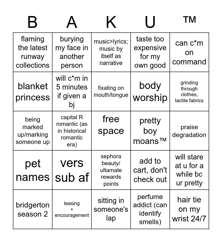 This bingo card has a free space and 24 words: vers sub af, teasing + encouragement, fixating on mouth/tongue, bridgerton season 2, can c*m on command, flaming the latest runway collections, blanket princess, burying my face in another person, pretty boy moans™, sephora beauty/ ultamate rewards points, body worship, being marked up/marking someone up, add to cart, don't check out, will stare at u for a while bc ur pretty, will c*m in 5 minutes if given a bj, perfume addict (can identify smells), praise degradation, music>lyrics; music by itself as narrative, grinding through clothes, tactile fabrics, capital R romantic (as in historical romantic era), hair tie on my wrist 24/7, pet names, taste too expensive for my own good and sitting in someone's lap.