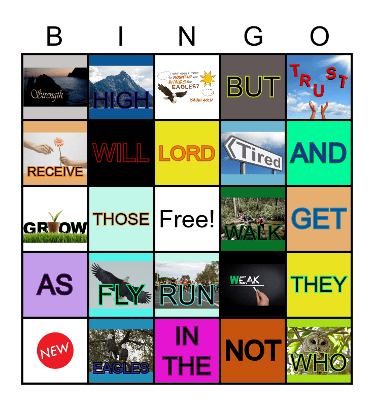 This bingo card has 14 images, a free space and 17 words: FLY, EAGLES, LORD, RECEIVE, HIGH, WALK, RUN, THEY, WILL, NOT, GET, AND, THOSE, WHO, AS, BUT and IN THE.