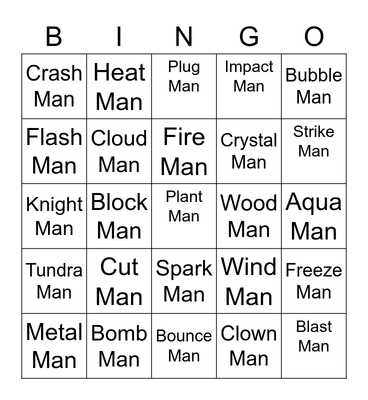 This bingo card has a free space and 24 words: Cut Man, Bomb Man, Fire Man, Metal Man, Bubble Man, Crash Man, Flash Man, Heat Man, Wood Man, Spark Man, Crystal Man, Knight Man, Wind Man, Freeze Man, Cloud Man, Clown Man, Aqua Man, Plug Man, Strike Man, Block Man, Blast Man, Tundra Man, Impact Man and Bounce Man.