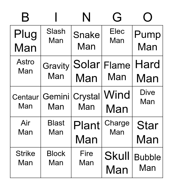 This bingo card has a free space and 24 words: Blast Man, Block Man, Solar Man, Strike Man, Pump Man, Plug Man, Astro Man, Slash Man, Wind Man, Plant Man, Flame Man, Centaur Man, Charge Man, Star Man, Gravity Man, Skull Man, Dive Man, Snake Man, Hard Man, Gemini Man, Bubble Man, Air Man, Elec Man and Fire Man.