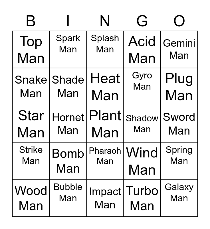 This bingo card has a free space and 24 words: Bomb Man, Bubble Man, Heat Man, Wood Man, Gemini Man, Top Man, Snake Man, Spark Man, Shadow Man, Pharaoh Man, Gyro Man, Star Man, Wind Man, Spring Man, Shade Man, Turbo Man, Sword Man, Splash Man, Plug Man, Hornet Man, Galaxy Man, Strike Man, Acid Man and Impact Man.